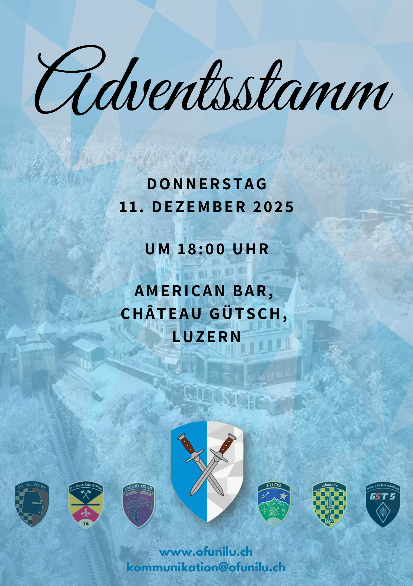 Adventsstamm Of@Campus LuzernDatum: Donnerstag, 11. Dezember 2025Zeit: 18.00 UhrOrt: American Bar, Château Gütsch, Luzern Liebe Vereinsmitglieder Wir laden herzlich zum diesjährigen Adventsstamm im traditionsreichen Château Gütsch ein (anders als ursprünglich vorgesehen, findet der Anlass nicht im Baloo statt). Die American Bar bietet einen hervorragenden Rahmen, um das Jahr in würdiger Weiterlesen