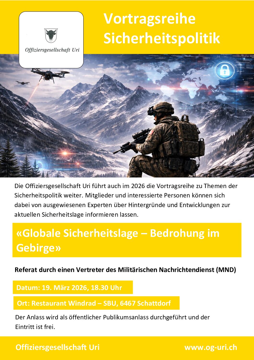 Die Offiziersgesellschaft Uri setzt ihre Vortragsreihe zu aktuellen Fragen der Sicherheitspolitik auch im Jahr 2026 fort. In dieser Ausgabe spricht ein Vertreter des Militärischen Nachrichtendienstes über die globale Sicherheitslage und mögliche Bedrohungen im alpinen Raum. Der Anlass bietet Mitgliedern sowie interessierten Personen die Gelegenheit, aus erster Hand Einblicke in aktuelle Weiterlesen